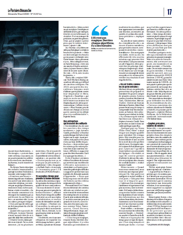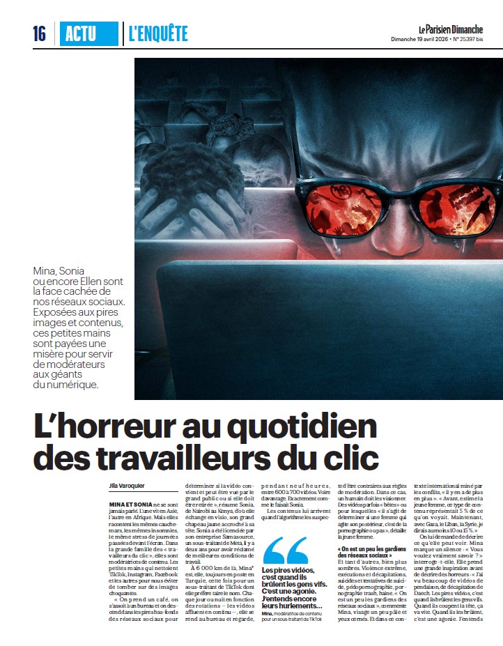 «L’horreur au quotidien des travailleurs du clic» (première partie de l’article ⤤ / seconde partie de l’article ⤤ ), Le Parisien, 19 avril 2026